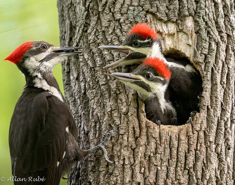 Also, leave downed trees in place rather than removing or burning them since they provide insect food for a variety of birds, including pileateds and other woodpeckers.