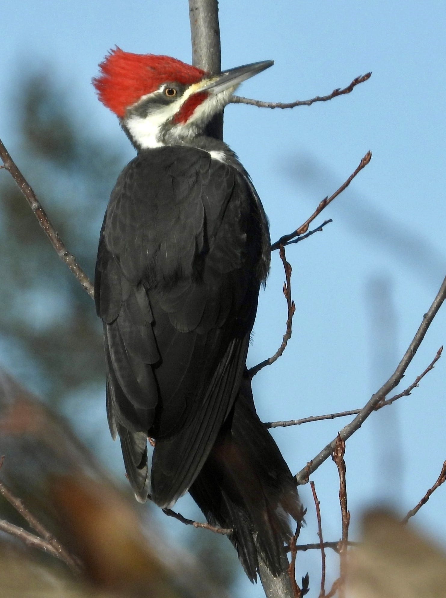 I heard it before I saw it. My mind filled with a litany of bad-news stories, I was walking down a dirt road that hugged a treed slope bordering fields when I heard a rapid-fire cuk cuk cuk cuk cuk ring out across the valley below me. Grinning in anticipation, I raised my binoculars and focused them on a dark, crow-sized bird pressed against the upper trunk of a cottonwood tree adjacent to a small stream. At once regal and comic, the bird’s striped face was topped by a jagged, eye-catching red crest that was raised in seeming agitation. I was looking at a Pileated Woodpecker, the largest extant woodpecker in the United States.