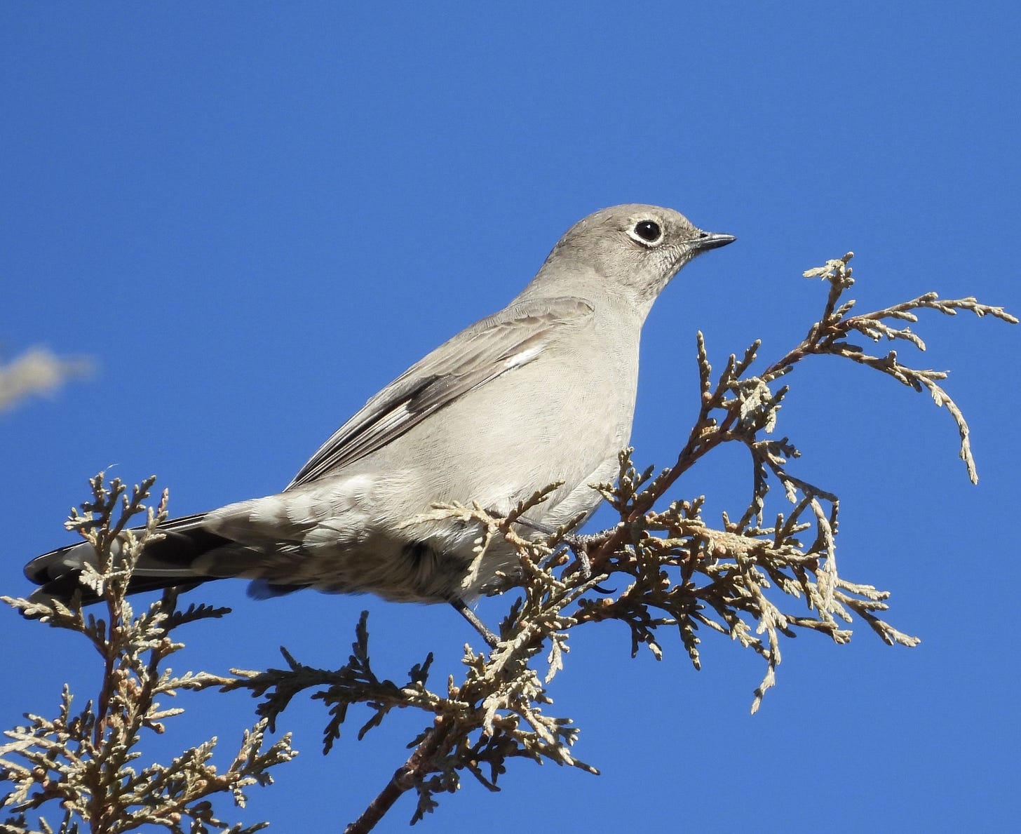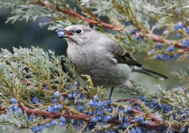Until recently, I rarely saw Townsend’s Solitaires during the breeding season, when they perch unobtrusively in open pine, fir, or spruce forests, sallying out like flycatchers to catch insects for themselves and their young. But in winter, I regularly walk through a dense concentration of solitaires. While some Townsend’s migrate to warmer areas in winter, others move short distances to lower elevations where juniper trees are abundant. The long, narrow valley bordering the topographical uplift where I live is cloaked in Rocky Mountain junipers and scattered ponderosa pines—ideal habitat for birds that survive winter’s cold and snow by feeding on juniper berries.